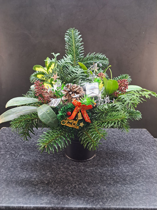 Kerststuk in zwart blikje met kerstgroen, houten poppetje en XMASboog met LEDlichtjes