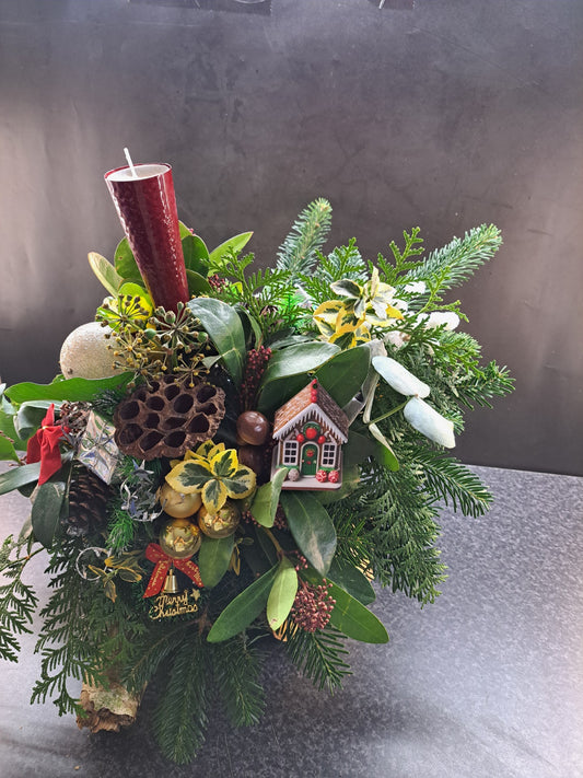 • Kerststuk in zwart blikje met kerstgroen, houten poppetje en XMASboog met LEDlichtjes