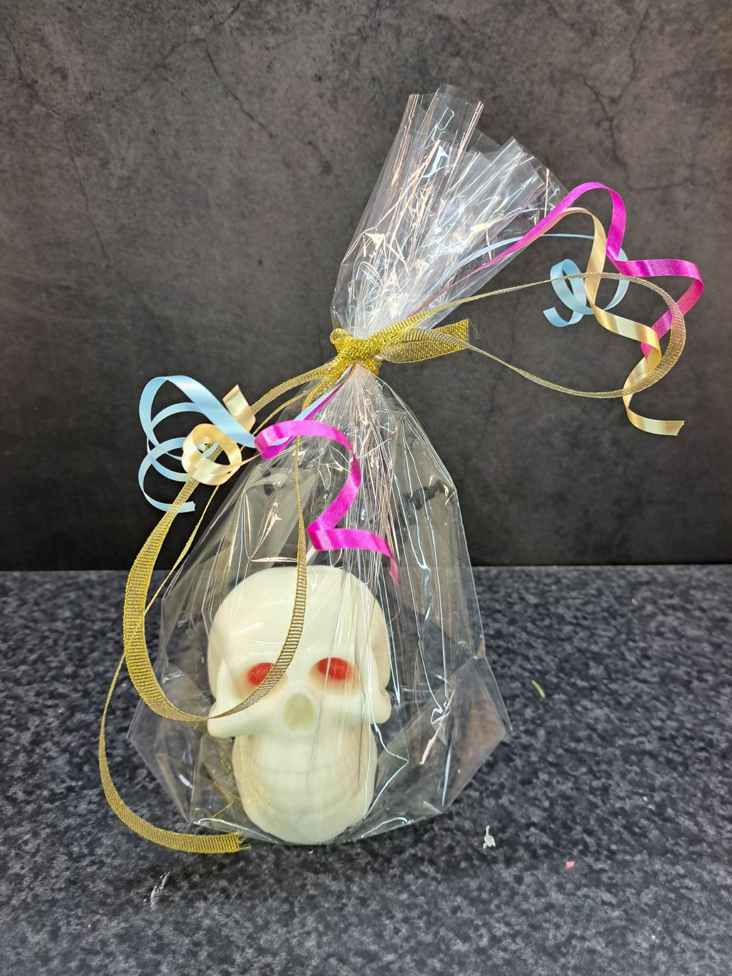 Deze bijzondere doodskop kaars, met opvallende rode ogen, is een echte blikvanger. De kaars is met de hand gegoten en afgewerkt met prachtige details, wat elk exemplaar uniek maakt. Een perfect cadeau voor liefhebbers van alternatieve of gothic decoratie, of gewoon als opvallend accent in je interieur.
