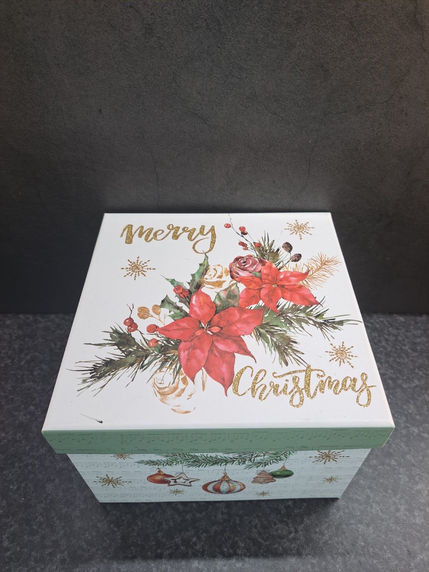 Mooie kerstdoos bedrukt met elegante kerstroos en de tekst "Merry Christmas" – perfect voor jouw cadeau!