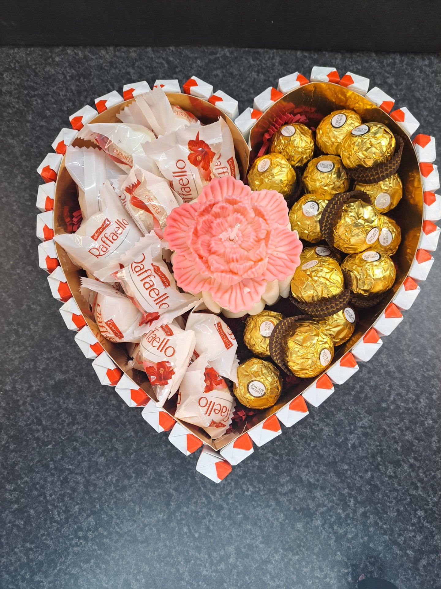 Verwen je geliefden met een heerlijk luxe chocolade hart, gevuld met Ferrero Rocher en Raffaello bonbons. Dit prachtige cadeau bevat bovendien een handgemaakte kaars, waardoor het niet alleen lekker, maar ook sfeervol is.