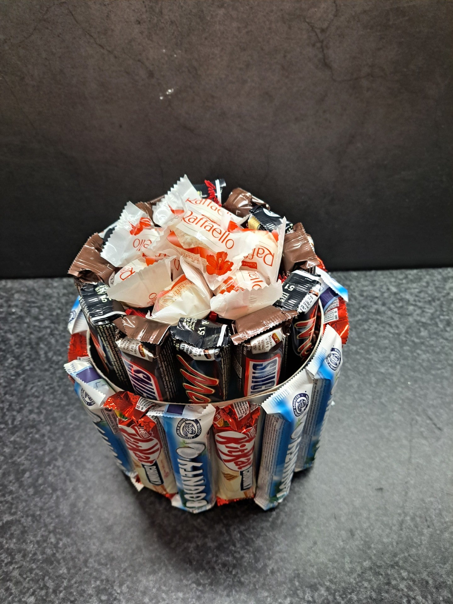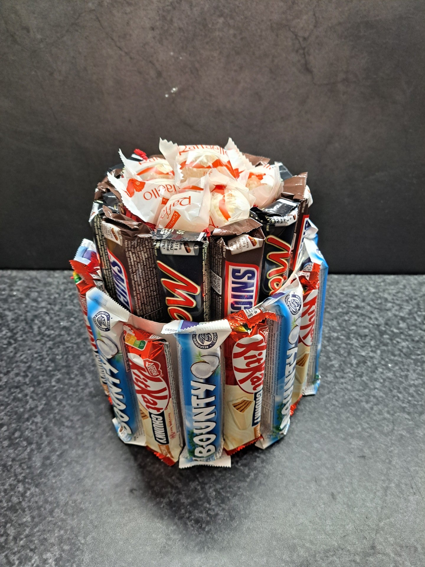 Ontdek de ultieme chocolade taart! Twee lagen, a 29 stuks rijkelijk bedekt met Mars, kitkat,Twix, Bounty, Snickers en afgewerkt met Raffaello. Prachtig verpakt in doorzichtige folie – ideaal als kerstcadeau, trouwcadeau of verrassing voor een chocoladeliefhebber.