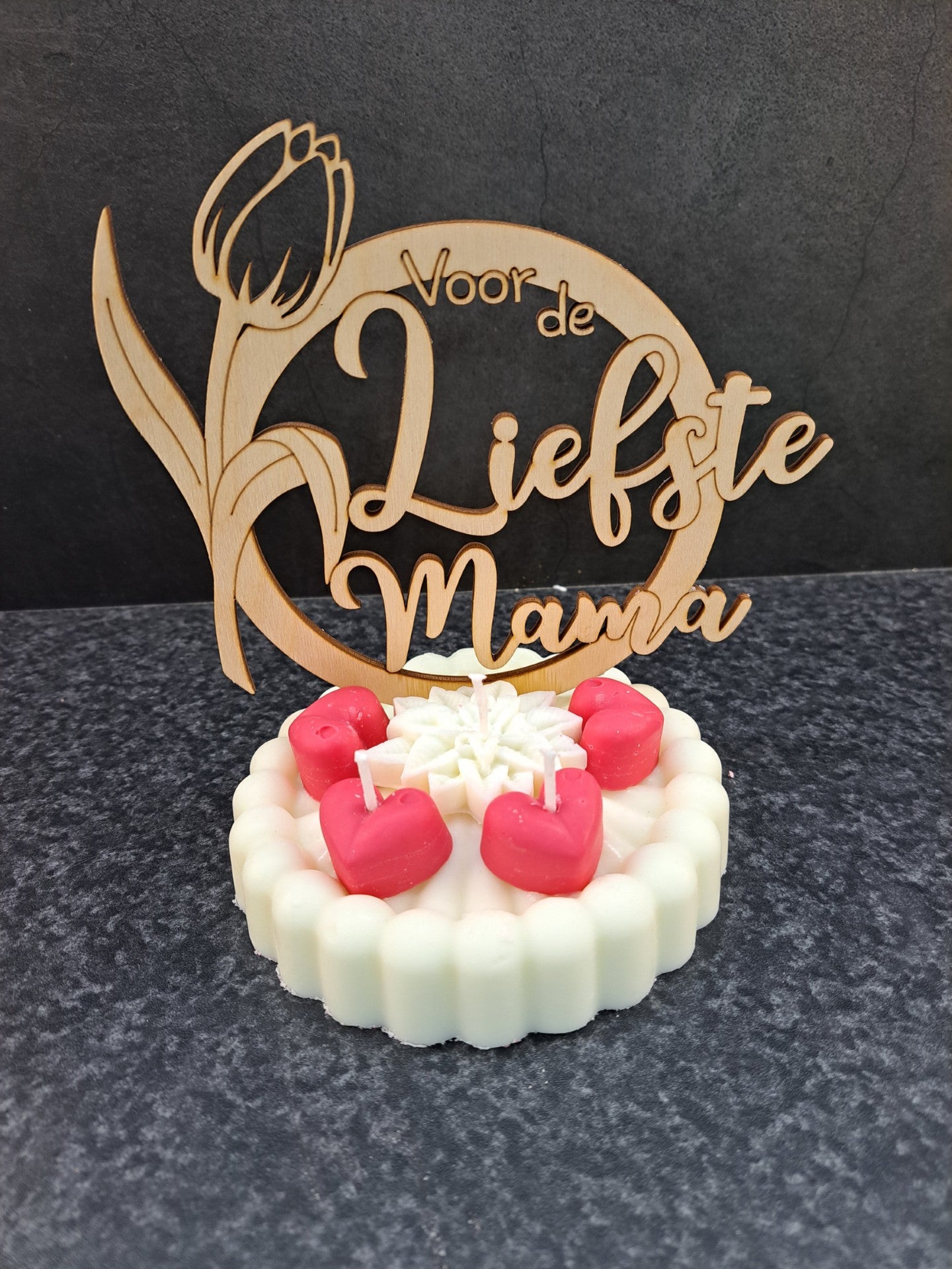 De kaars is prachtig afgewerkt met een schattig hartje en staat op een houten rondje met de tekst: “Voor de liefste mama”. Dit maakt het een uniek en persoonlijk geschenk dat zeker de aandacht trekt en de liefde voor je moeder symboliseert.